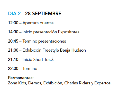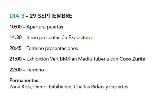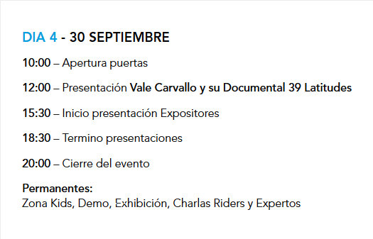 Pero este evento no consiste sólo en una feria en la que ir a mirar. También durante los 3 días se realizarán múltiples charlas y actividades a cargo de riders y expertos. Revisa el programa: