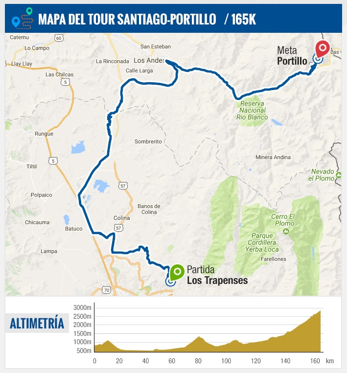 La ruta es la siguiente: Los Trapenses – Pie Andino – Chicureo – Lampa – cuesta El Manzano – Los Desiertos – cuesta Chacabuco – bypass Los Andes – Los Azules – Guardia Vieja – Portillo.