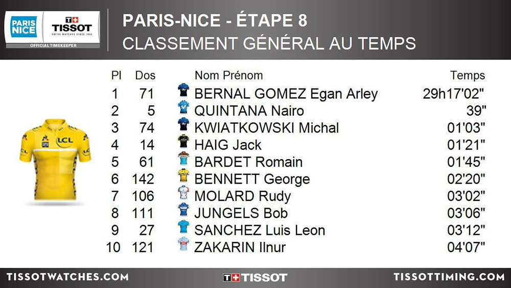 El segundo lugar del evento fue para Quintana, el tercer puesto fue para el polaco Michal Kwiatkowski (Sky) a 1’03, para completar el podio. En el cuarto lugar quedó el australiano Jack Haig (Mitchelton-Scott) y en el quinto el francés Romain Bardet (AG2R La Mondiale) a 1’21 y 1’45 respectivamente.