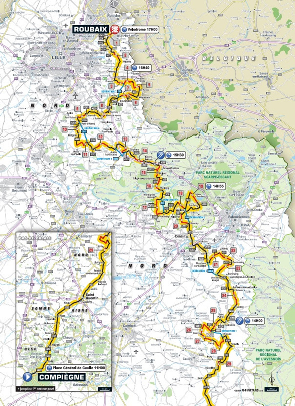 La carrera comienza en Compiegne, cerca de París, y finaliza como es tradicional en el velódromo de la ciudad de Roubaix. En el recorrido los ciclistas enfrentarán 29 sectores de adoquines completando un total de casi 55 kilómetros, de los cuales hay 3 considerados de 5 estrellas (mayor dificultad) como son Trouée d’Arenberg, Mons-en-Pévèle y Carrefour de l’Arbre.