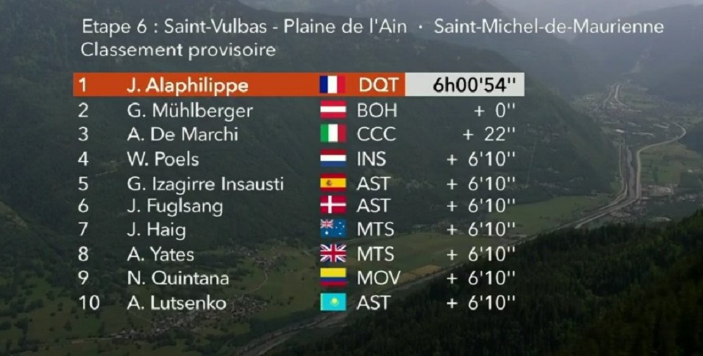 La etapa de 228 km que partió desde Saint-Vulbas hasta Saint-Michelle de Maurienne dejó como ganador al francés, quien se mantuvo de cerca a Mühlberger durante los últimos 6 km de descenso hasta que en los últimos metros apretó para hacerse con su primer triunfo en el Dauphiné desde la 4ª etapa del año pasado.