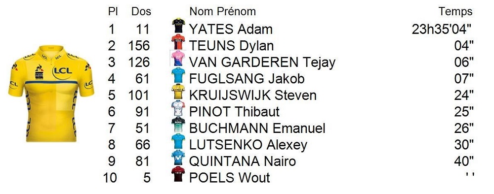 Adam Yates (Mitchelton-Scott) se mantuvo por tercer día seguido al frente de la clasificación general luego deculminar 8º en la sexta etapa este viernes.