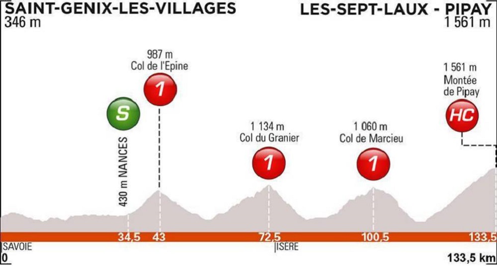 El sábado continuará el Critérium du Dauphiné con la 7ª etapa, que también será de montaña pero a una distancia más corta respecto a la sexta, con 133 km de recorrido. El punto de partida será Saint-Geniz-les-Villages-Les-Sept-Laux y terminará en Pipay; y la altura máxima le corresponderá al Montée de Pipay, de categoría especial (19 kilómetros al 6,9%).