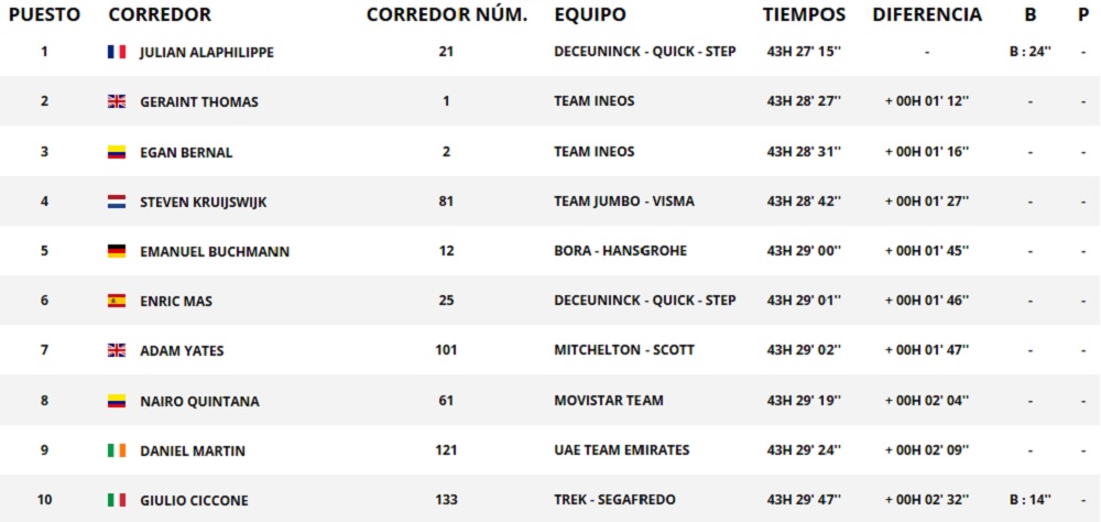 Por tercer día seguido Julian Alaphillippe (Deceunick-Quick Step) conservó el maillot amarillo totalizando un tiempo 43h 27′ 15». Ya es la sexta vez en esta edición que el francés comanda la tabla general.