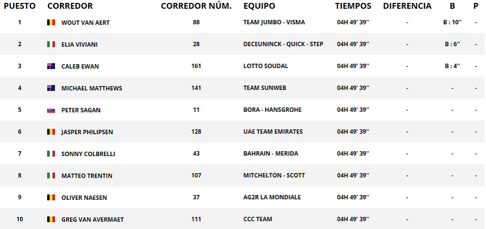 La etapa se decidió por escasos centímetros, luego que van Aert tirara su bici hacia la línea de meta mientras competía con el italiano Elia Viviani (Deceunick-Quick Step) y así terminar con un crono de 04h 49′ 39». Caleb Ewan (Lotto-Soudal) finalizó tercero.