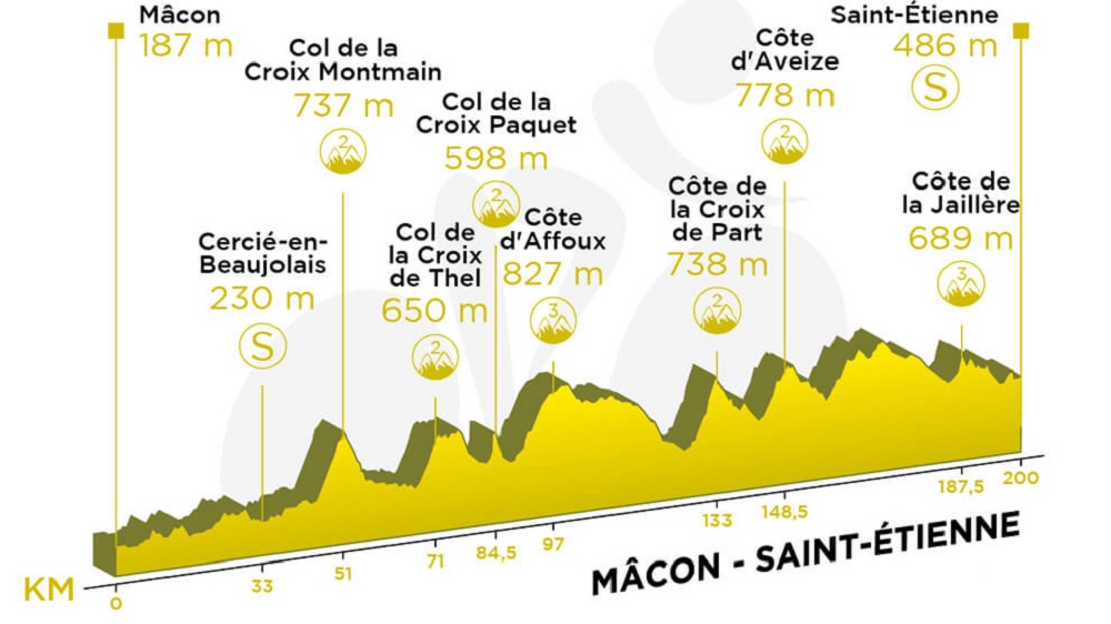 El recorrido hacia Saint-Étienne estará marcado por los aromas del Beaujolais en su primera parte. Sin embargo, un auténtico vía crucis espera a los reacios a las subidas. Entre la Croix de Montmain, la Croix de Thel, la Croix Paquet, la Croix de Part y la cota de Aveize, los corredores tendrán que acostumbrase a todo tipo de pendientes: ¡para un total de 3.800 metros de desnivel acumulado positivo!