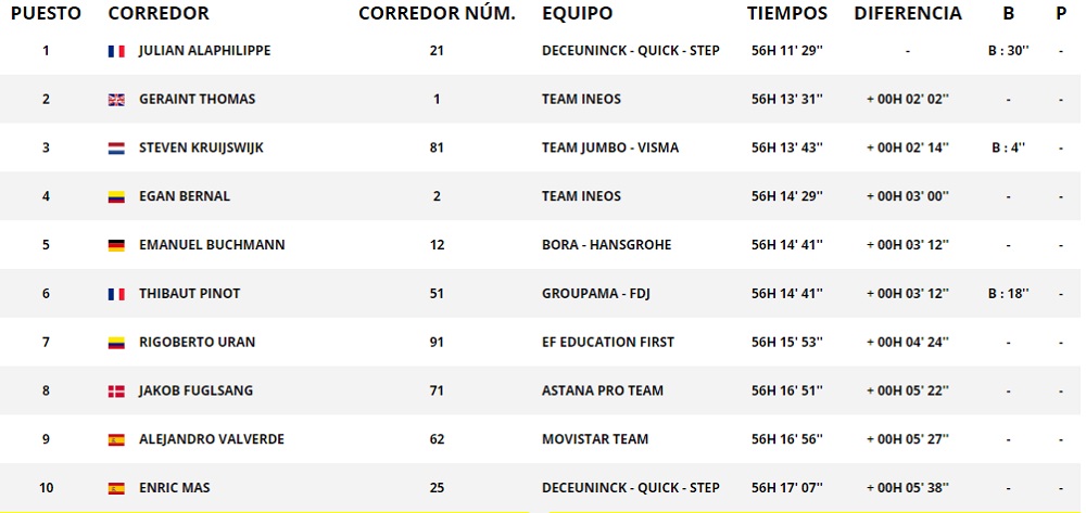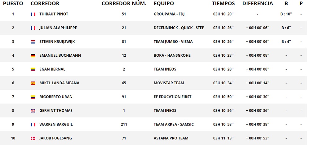 Pinot finalizó primero el recorrido de 117,5 km que comenzó en Tarbes con un crono de 3H 10′ 20», seguido 6’’ después por su compatriota y líder de la general Julian Alaphilippe (Deceunick-Quick Step). El holandés Steven Kruijswijk (team Jumbo-Visma) terminó tercero.