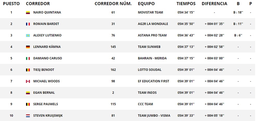 Gracias a un decisivo ataque en solitario a 7,5 km de la cima del Col du Galibier, Quintana se escapó y cruzó la meta en 05H 34′ 15». “Es el reflejo de todo el trabajo que hemos hecho. He trabajado muchísimo desde el inicio del Tour para estar aquí”, dijo el colombiano al final.