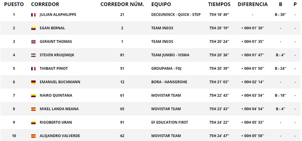El francés Julián Alaphillippe (Deceunick-QuickStep) sigue al frente de la tabla general con su bici Specialized por undécimo día de competencia consecutivo portando así nuevamente el maillot amarillo y que vestirá por decimocuarta ocasión el jueves, con un crono de 75h 18′ 49». Quedan sólo tres pruebas por delante y ahora tiene nuevo escolta, el colombiano Egan Bernal (Team INEOS) pisándole los talones a 1′ 35′.