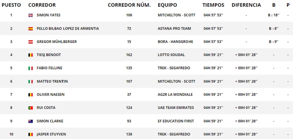 El tiempo final de Yates fue de 04H 57′ 53». En segundo lugar terminó el español Pello Bilbao (Astana Pro Team) y el tercer lugar fue para el austríaco Gregor Mühlberger (Bora-Hansgrohe).