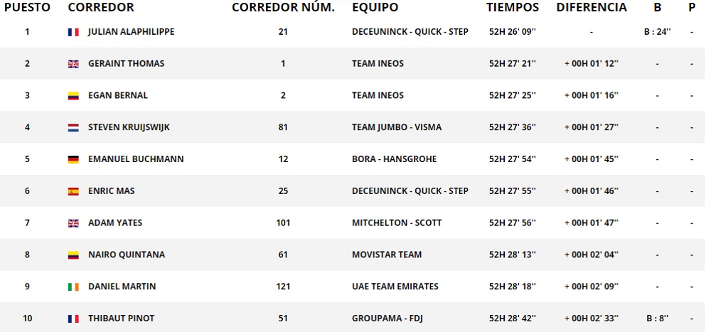 Este jueves se cruzó la barrera de los 2.000 km de distancia recorridos (2181.1 en total) y por quinto día seguido Julian Alaphillippe (Deceunick-Quick Step) se mantuvo al frente de la tabla general con el maillot amarillo –por octava vez en lo que va de Tour- totalizando un tiempo 52h 26′ 09».