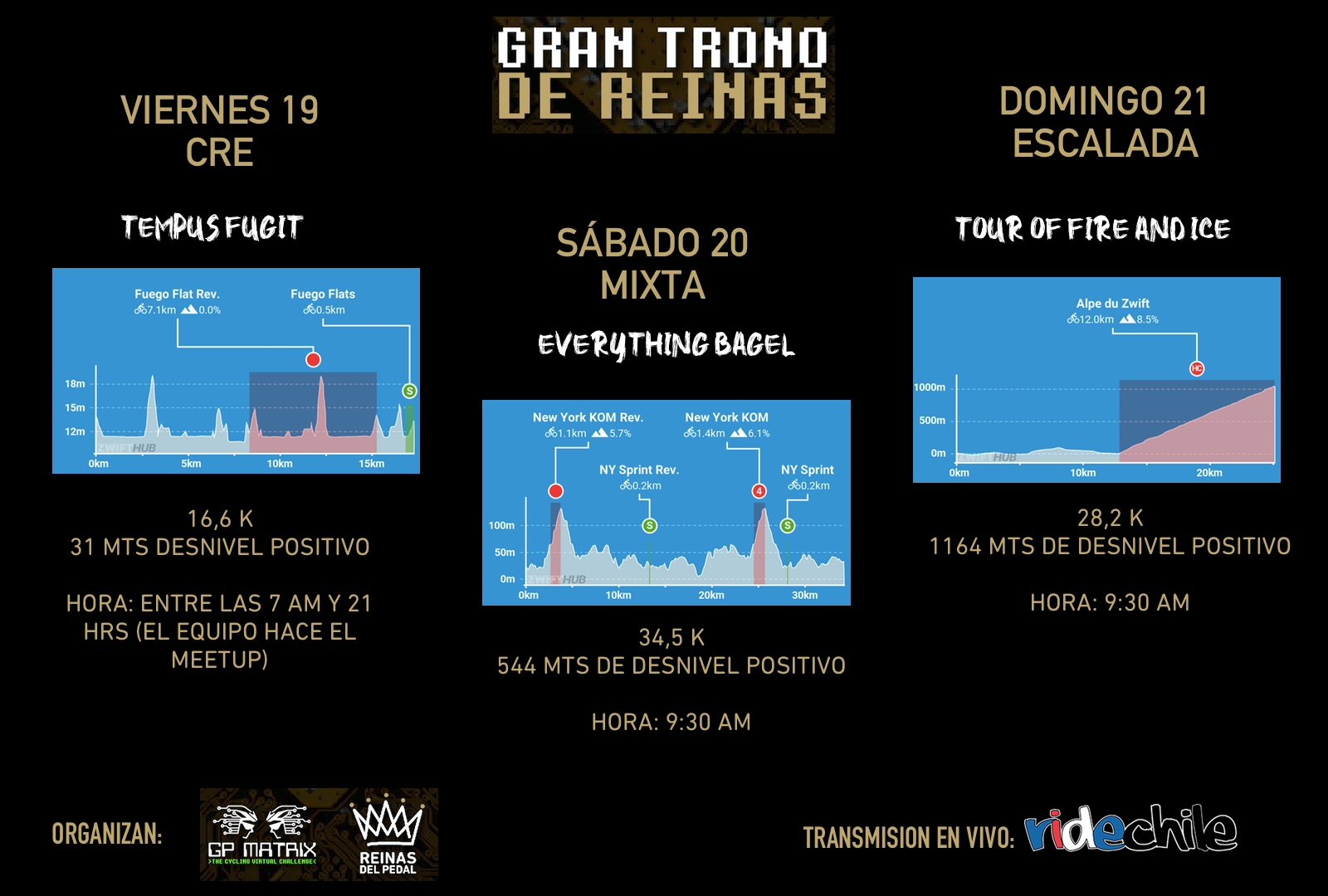 El Gran Trono de Reinas, es una gran carrera virtual femenina que se correrá en Zwift y consta de 3 etapas: