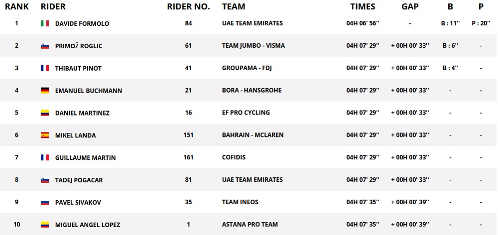 Luego de tres etapas, el esloveno Primoz Roglic, que fue el scolta de Formolo a 33 segundos, sigue comandando la clasificación general, como lo hace el team Jumbo-Visma en la clasificación por equipos con crono acumulado 39h 47′ 41».