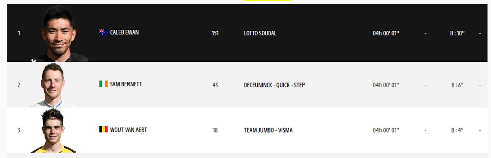 Ewan marcó tiempo 4h 00′ 01» tras superar apenas por milímetros a Sam Benett (Deceunick Quick-Step) y Wout van Aert (JumboVisma) con un sprint que él mismo calificó como frenético.