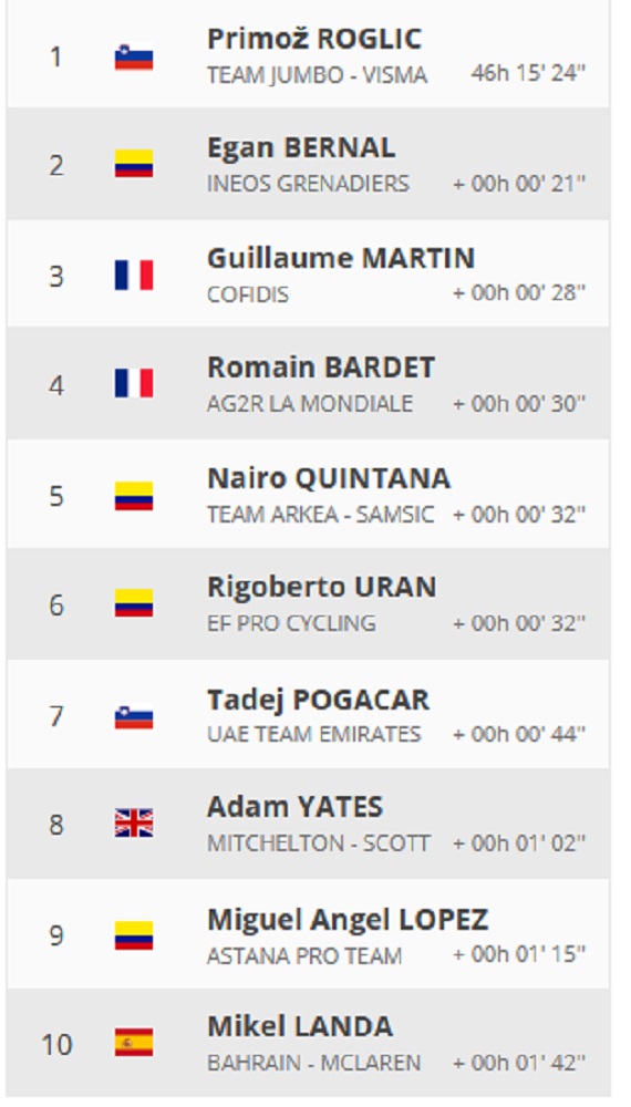 El esloveno Primoz Roglic (JumboVisma) continúa portando el maillot amarillo (con tiempo 46h 15′ 24′) al frente de la clasificación general.