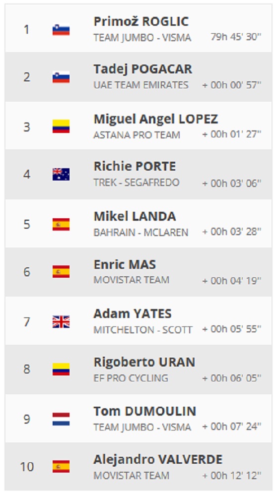 - Maillot Amarillo (General): Primoz Roglic (JumboVisma) 79h 45′ 30”