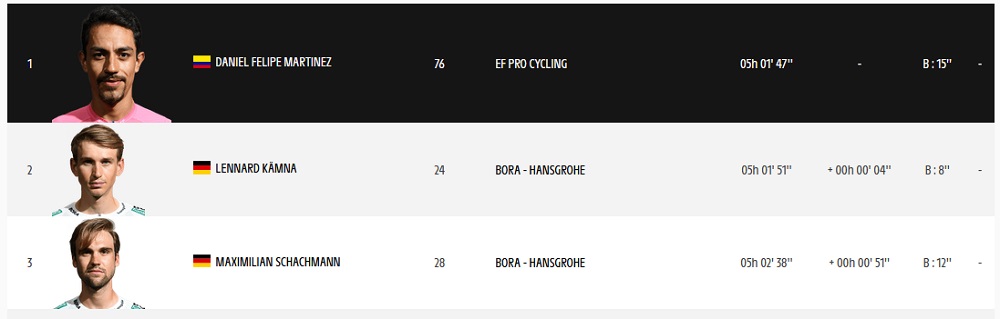 Martínez, ganador de la Critérium du Dauphiné, terminó con tiempo 5h 01′ 47» en la dura prueba de alta montaña que tuvo 4.400 metros de desnivel acumulado y que le hizo dudar en algún momento de poderío ante los alemanes Lennard Känma y Maximilian Schachmann de Bora-Hansgrohe, sus acompañantes en el podio.