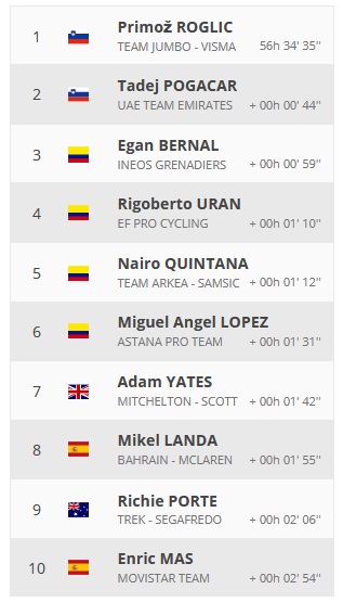 El esloveno Primoz Roglic (JumboVisma) continúa portando el maillot amarillo (con tiempo 56h 34′ 35′) al frente de la clasificación general, donde figuran cuatro latinoamericanos dentro del Top 10, escoltado a +44 por su compatriota Tadej Pogacar (UAE Emirates team), nuevo portador del maillot blanco que viste el mejor joven, en detrimento del campeón reinante Egan Bernal.
