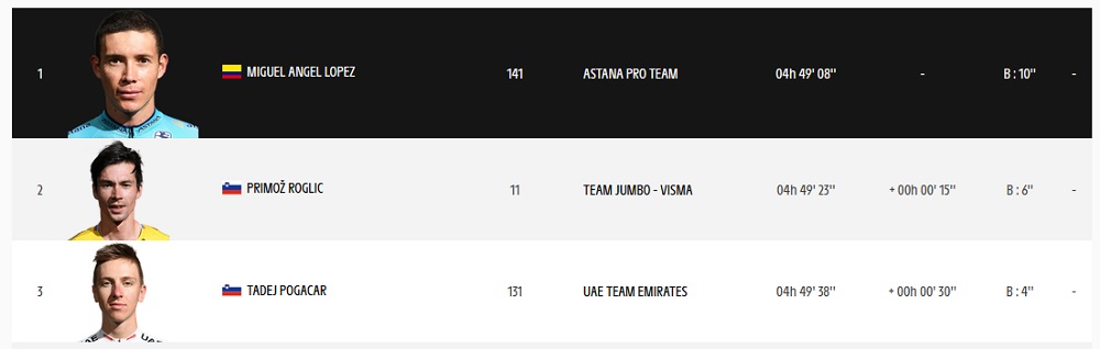 López logró imponerse a los eslovenos Roglic y Tadej Pogacar (líder de la clasificación joven), quienes continúan primero y segundo general, pero acortó el tiempo a +1:26 con respecto al líder.