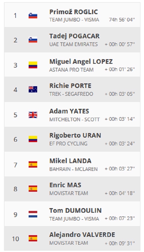 - Maillot Amarillo (General): Primoz Roglic (JumboVisma) 74h 56′ 04”