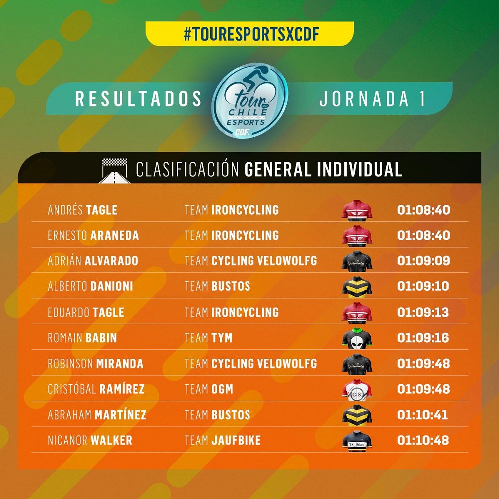 Tagle ganó la general de la etapa 1 “Dust in the Wind” de Zwift con un tiempo de 1:08:40, en segundo lugar terminó Ernesto Araneda, también de Ironcycling con crono final de 1:08:40 y el podio de la primera etapa fue de Adrián Alvarado (Cycling Velowolf) con 1:09:09.