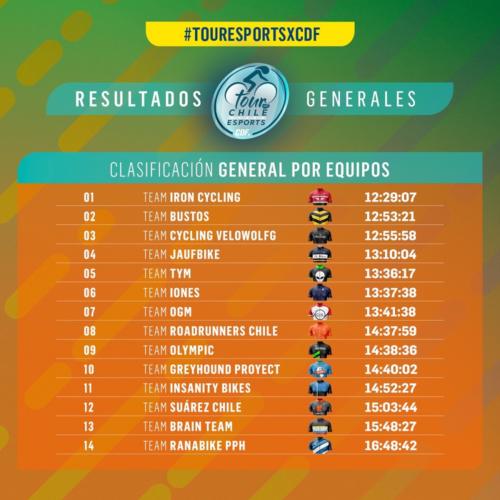 En cuanto a la clasificación general por equipos, lidera el Team Ironcycling, en segundo lugar el Team Bustos y el tercer puesto actual es de Cycling Velowolfg. Así transcurre la tabla con tiempos: