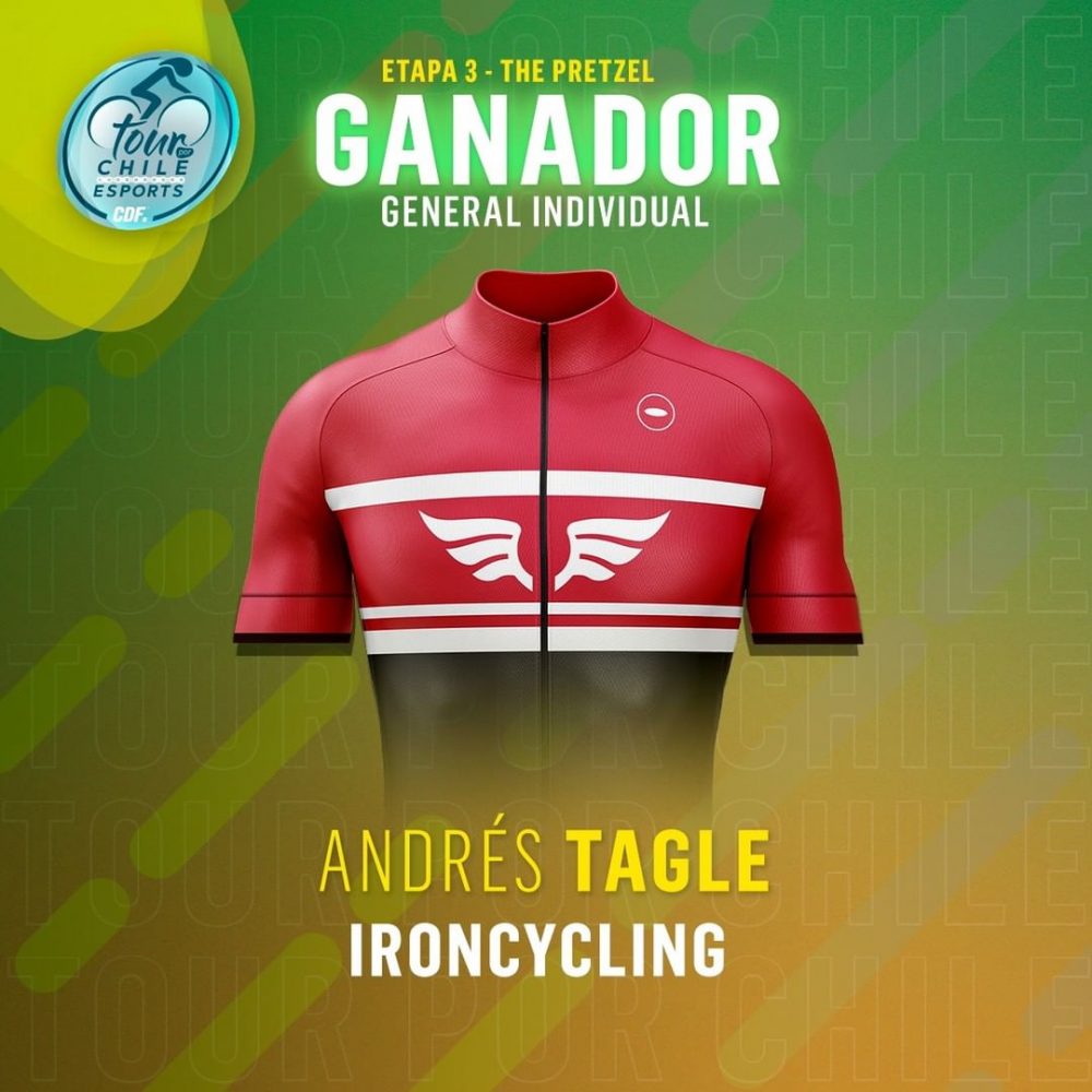 Este miércoles 4 de noviembre se disputó la tercera (y anteúltima) etapa del Tour por Chile eSports 2020, un torneo de ciclismo virtual vía Zwift, en el cuál Andrés Tagle del Ironcycling fue el ganador de la tercera fecha y lidera la clasificación general.