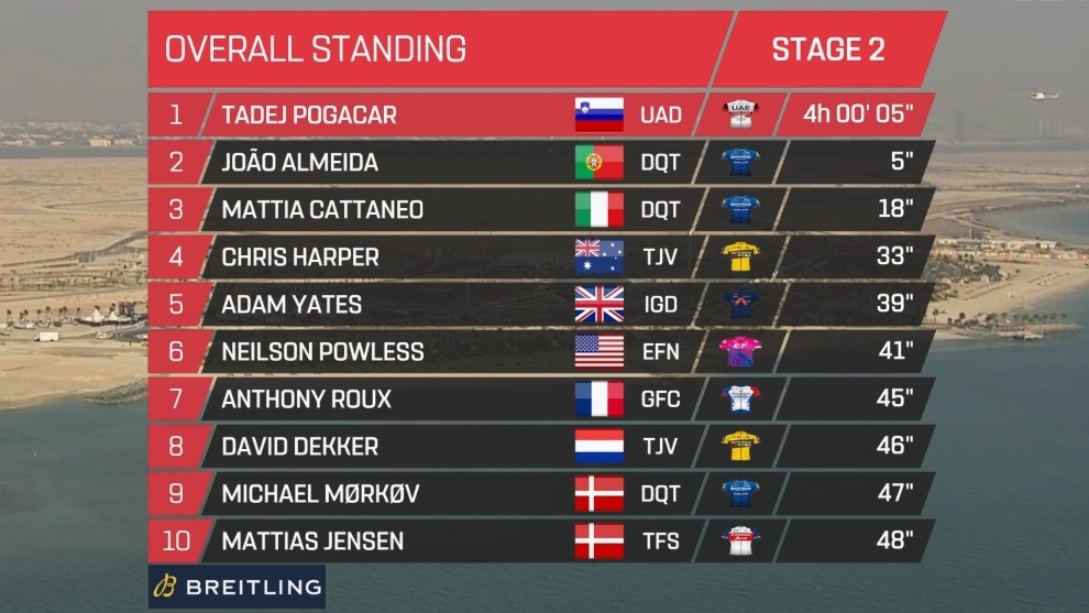 A van der Poel le quedará el sabor agridulce de haber ganado la etapa inicial, desde Al Dhafra Castle hasta Al Mirfa aunque (llana de 176 km) no podrá seguir compitiendo y tras realizarse la segunda etapa hoy, Tadej Pogacar (UAE Emirates team) asumió el liderato aunque el ganador fue el italiano Filippo Ganna (INEOS Grenadier) imponiéndose en la prueba contrarreloj individual de 13 km celebrada en Isla Al Hudayriat con tiempo 13 minutos 56 segundos.