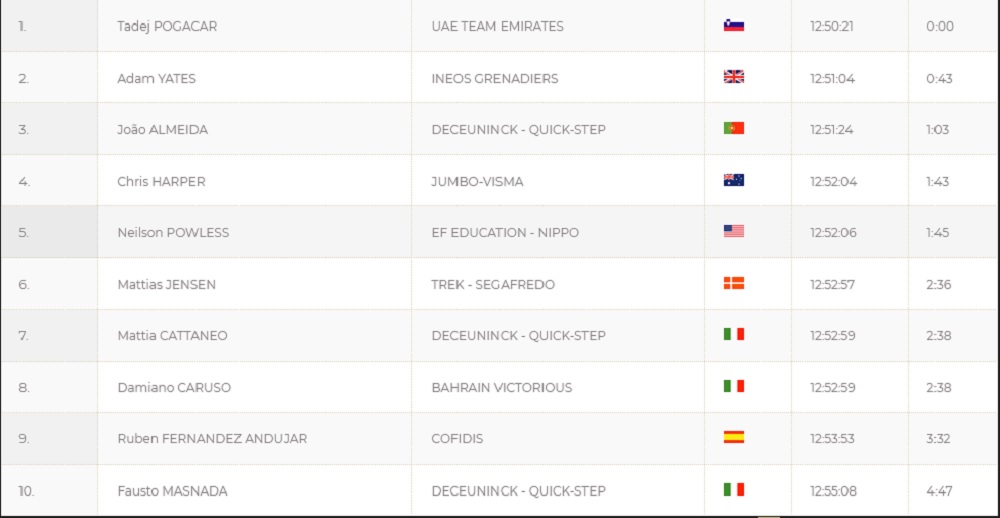 Sin embargo, el esloveno Tadej Pogacar se mantiene como líder en la clasificación general del UAE Tour 2021 con +43 de ventaja sobre Adam Yates (INEOS Grenadier)