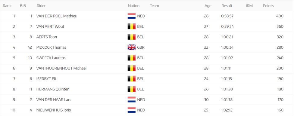 Con el triunfo en Ostende, Van der Poel se convirtió en el primer corredor que llega a cuatro títulos mundiales desde 1986, cuando el suizo Albert Zweifel consiguió el quinto.