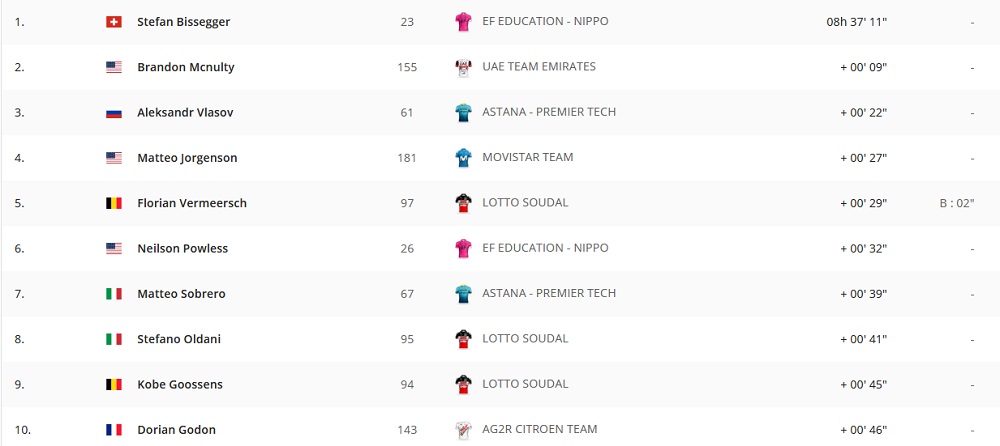 Con el resultado de hoy, Bisseger mejoró su tiempo personal a 8:37:11, desplazando al australiano Michael Matthews. Sobre su liderato en la general, Bisseger expresó que “es un sueño hecho realidad. Ves carreras como esta imaginando como se sentiría vestir la camiseta amarilla”.