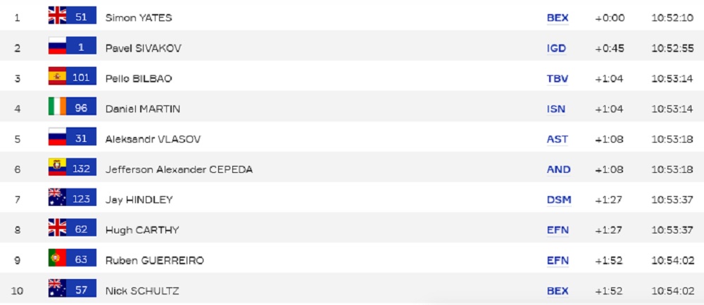 Entre tanto, el británico Simon Yates, se mantiene como líder en la clasificación general, acumulando tiempo de 10:52:10.