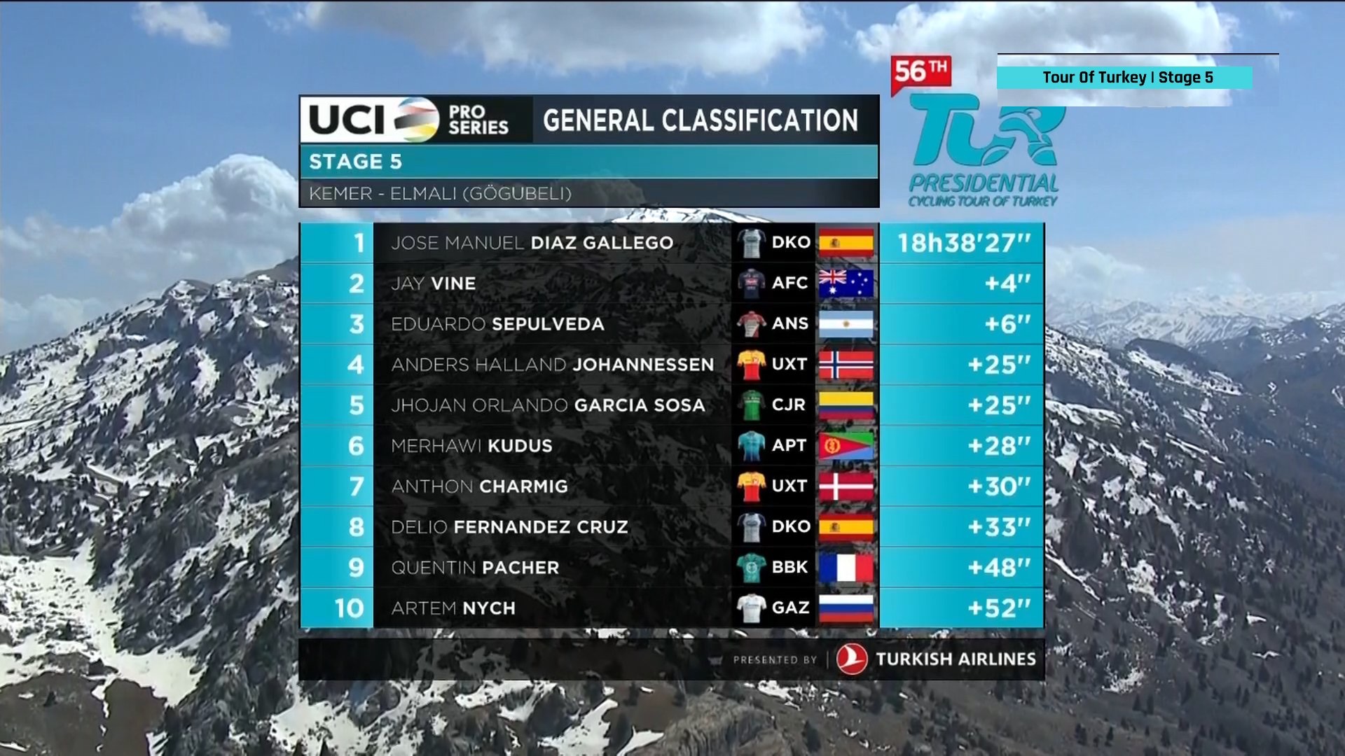 El español José Manuel Díaz (team Delko) se instaló como nuevo líder de la clasificación general individual la 56ª edición del Tour de Turquía, luego de proclamarse ganador de la quinta etapa, disputada entre Kemer y Elmalı District, considerada como la etapa reina del certamen, con 160.3 km de recorrido de montaña.