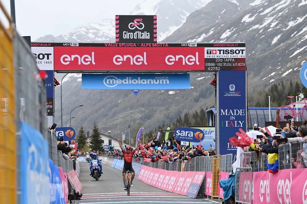 El ciclista italiano Damiano Caruso (Bahrain Victorious) ganó la etapa 20 del Giro de Italia, en un recorrido de 164 kilómetros de montaña entre las zonas de Verbania, Valle Spluga y Alpe Motta, en una jornada que tuvo como protagonista a Colombia al tener a dos de sus ciclistas en podio.