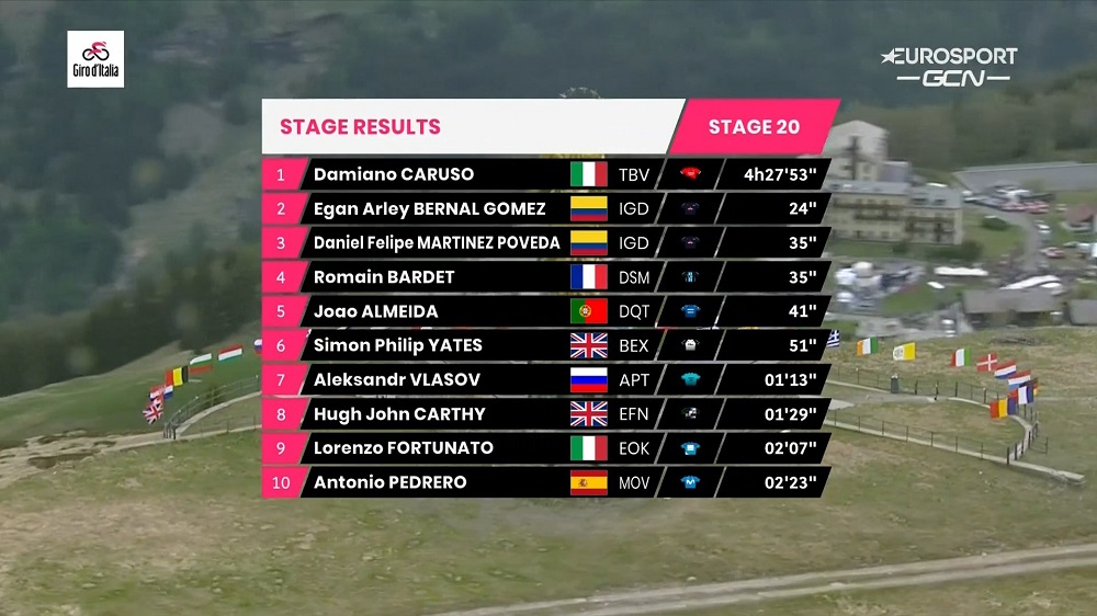 Caruso fue el primero en cruzar la meta y lo logró con un tiempo de 4 horas, 27 minutos con 53 segundos, mientras que los colombianos Egan Bernal (+24’) y Daniel Martínez (+35’) del Ineos Grenadiers, terminaron segundo y tercero del día, respectivamente.