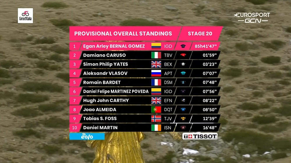 - Maglia Bianca (mejor joven): Egan Bernal (INEOS Grenadiers) 85:41:47