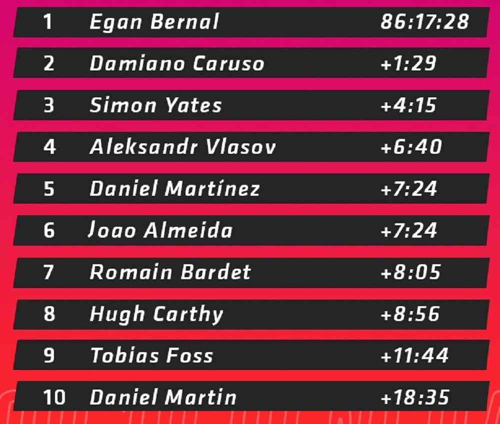 - Maglia Rossa (mejor general): Egan Bernal (INEOS Grenadiers) 86:17:28