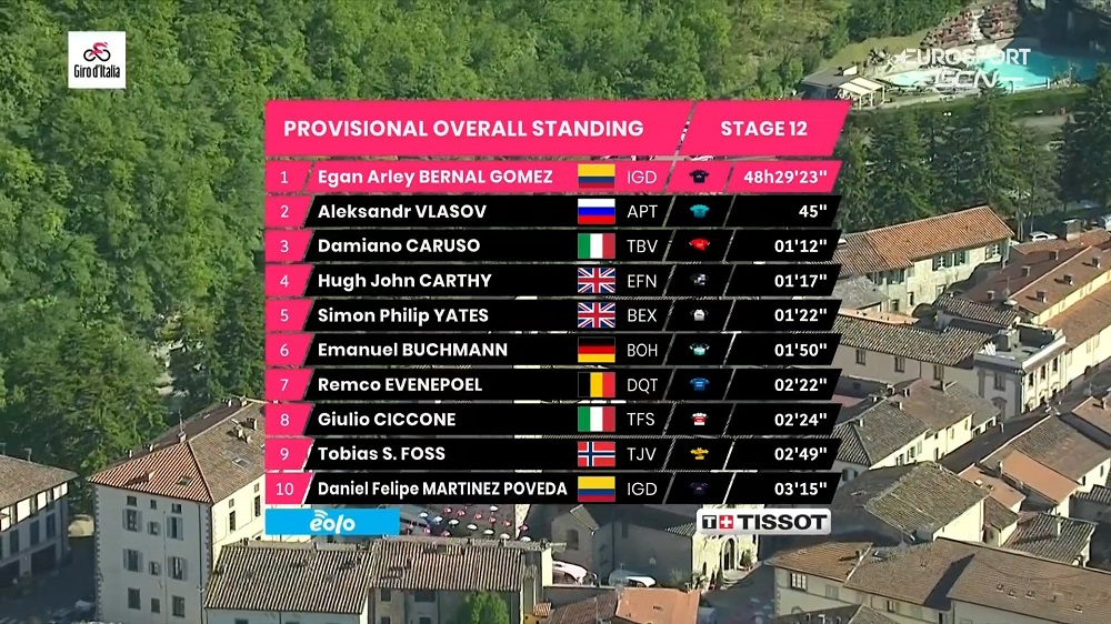 A pesar del triunfo de Vendrame, el colombiano Egan Bernal (Ineos-Grenadiers) sigue siendo el portador de la Maglia Rossa con un tiempo acumulado de 48:29:23, en segundo lugar se ubica el ruso Aleksandr Vlasov (Astana) a 45 segundos y el italiano Damiano Caruso (Bahrain-Victorious) como tercero, a 1 minuto con 15 segundos de Bernal.