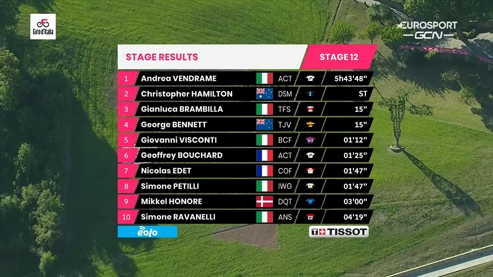 El ciclista italiano Andrea Vendrame (Ag2r-Citroën) se impuso en la etapa 12 del Giro de Italia, en una jornada de 212 kilómetros entre las localidades de Siena y Bagno Di Romagna, donde le ganó un mano a mano en la parte final del recorrido al australiano Chris Hamilton (Dsm) y donde el colombiano Egan Bernal (Ineos) sigue liderando la clasificación.