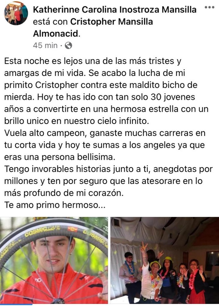 La noche de este lunes 10 de mayo se confirmó en redes sociales el lamentable fallecimiento del destacado ciclista y seleccionado nacional Cristopher Mansilla Almonacid, de apenas 30 años, a causa del coronavirus.