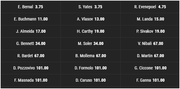 En Ridechile nos dimos una vuelta por las casas de apuestas y más o menos todos coinciden en colocar al colombiano Egan Bernal (INEOS Grenadiers ) y al británico Simon Yates(Team BikeExchange) como los más probables 1 y 2 del evento.El sitio Bwin, por ejemplo, paga 3,75 veces por Egan y Yates como se ve en el siguiente cuadro: