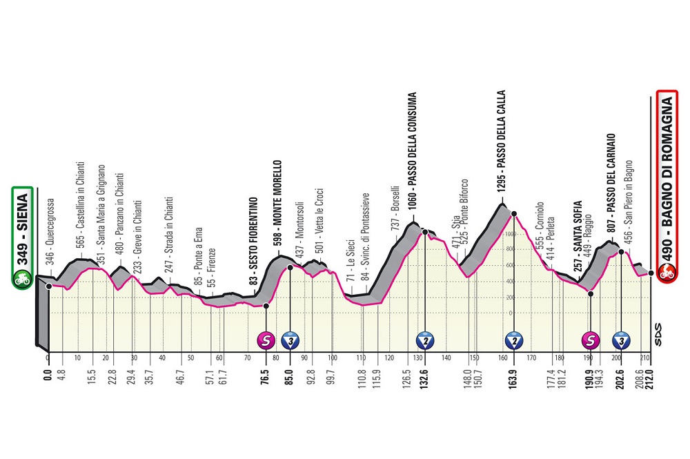 El jueves continuará la 104ª edición del Giro d’Italia, con la 12ª Etapa, partiendo desde Siena hasta Bagno di Romagna con 212 km, de media montaña con puertos de 4ª categoría.