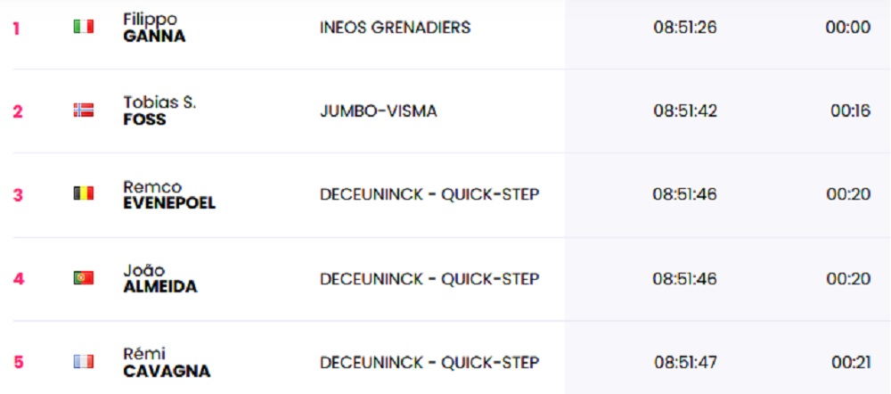 Luego de tres etapas, Filippo Ganna sigue como portador de la Maglia Rosa con tiempo total 08:51:26.