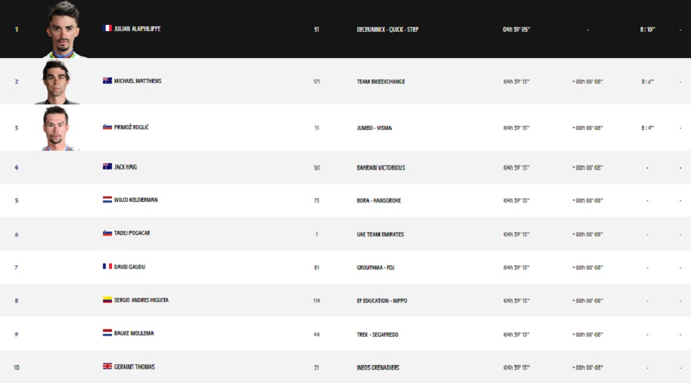 - Maillot amarillo (general): Julian Alaphilippe (Deceuninck-QuickStep) 4:39:05
