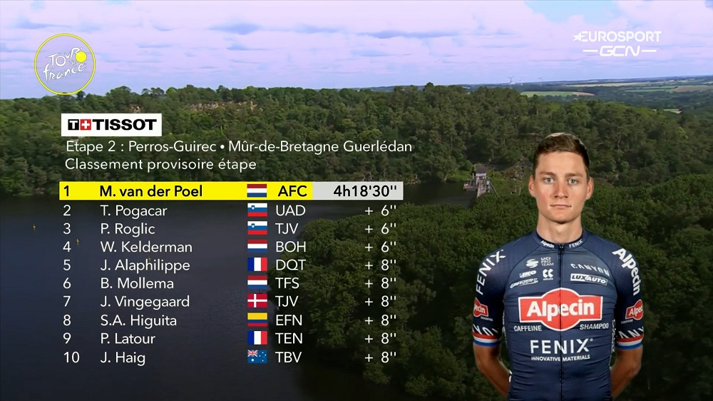 Van der Poel terminó primero de la etapa con un tiempo de 4 horas, 18 minutos con 30 segundos, en segundo lugar terminó el esloveno Tadej Pogacar (UAE Team Emirates) con un crono oficial de 4:18:36 y el podio lo completó el también esloveno Primoz Roglic (Jumbo Visma) con un tiempo de 4:18:36.