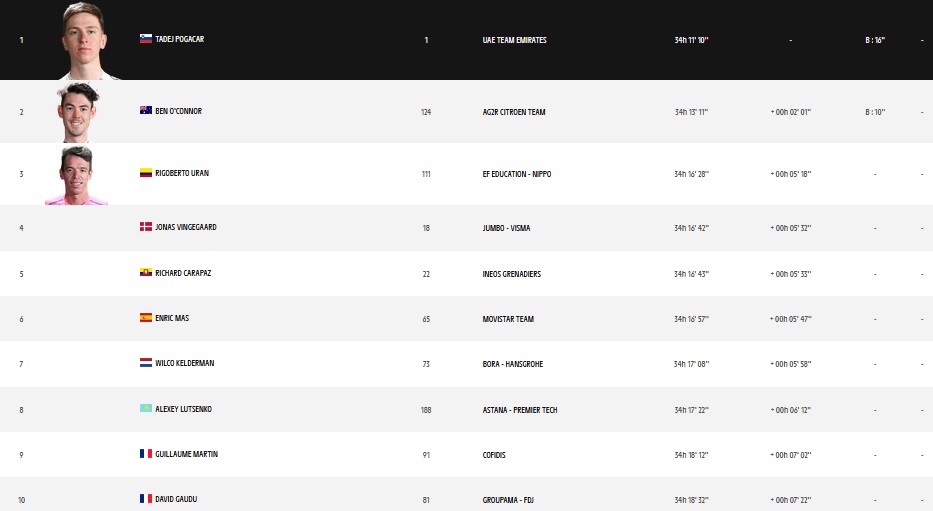 Después de haber recorrido 1.447,2 km, Pogacar lidera la clasificación general con 34:11:10, con una cómoda diferencia de +2:01 sobre el segundo lugar.