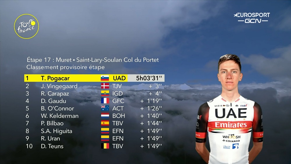 Pogacar, una de las estrellas del Tour con apenas 22 años, ganó la etapa vestido de amarillo, sin duda un lujo. El esloveno completó el recorrido de 178,4 kilómetros en un tiempo oficial de 5:03:31. En segundo lugar terminó el danés Jonas Vindegaard (Jumbo Visma) con 5:03:34 y el podio lo completó Richard Carapaz con 5:03:35.