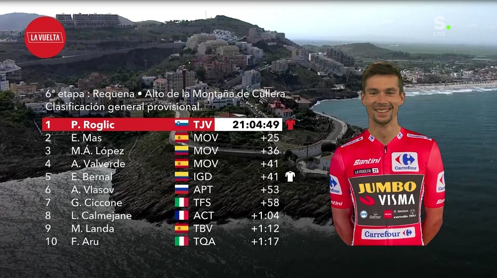 Luego de finalizada esta sexta etapa, así transcurre la clasificación general, como Primoz Roglic nuevamente siendo el portador del maillot rojo, siendo perseguido por tres ciclistas del Team Movistar: