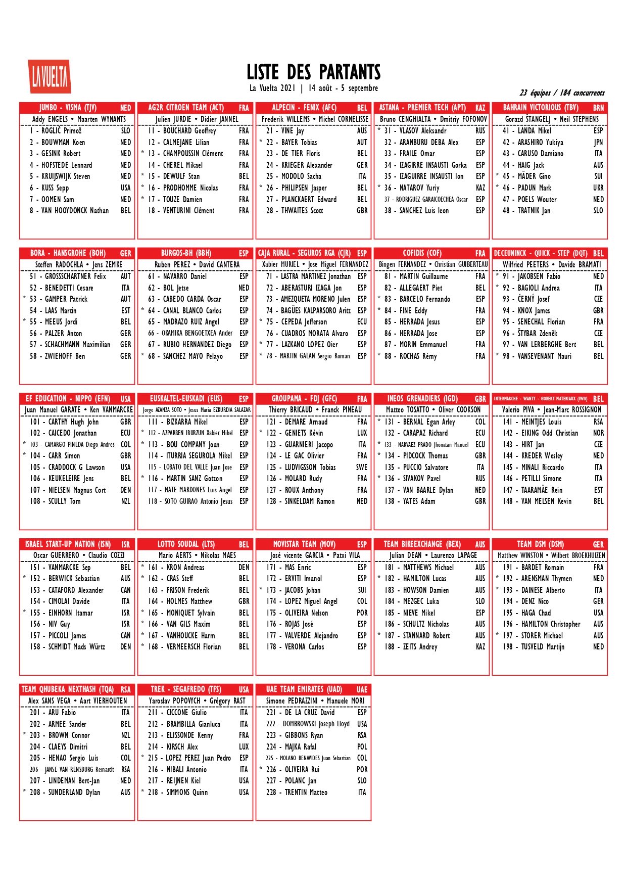 Un total de 23 equipos dirán presente en la 76ª edición La Vuelta a España, que se disputará a partir de mañana 14 de agosto en Burgos, y lucharán por el máximo reconocimiento hasta el domingo 5 de septiembre en Madrid.