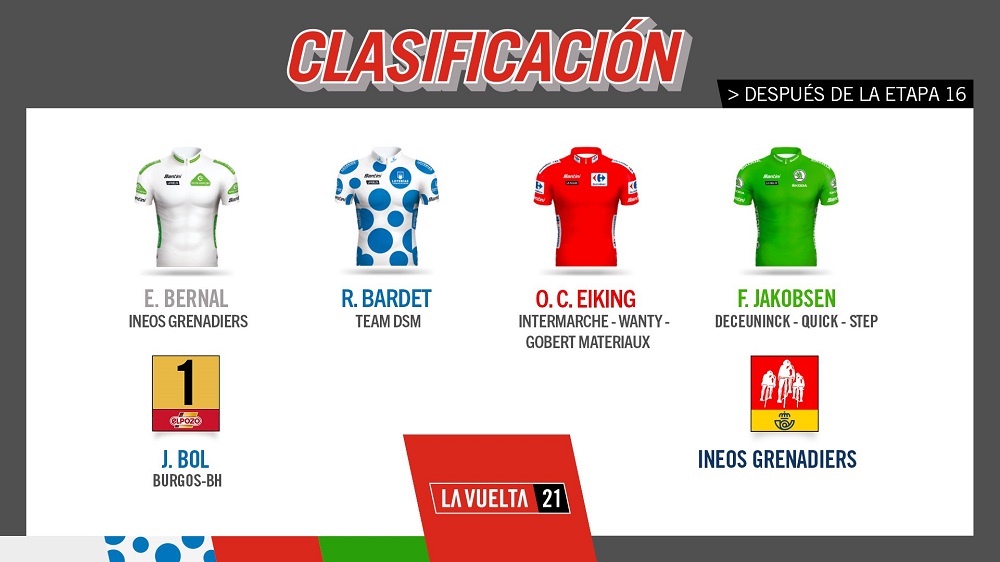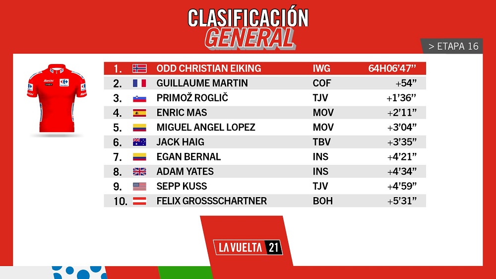 Entre tanto, el noruego Eiking se sobrepuso tras el segundo día de descanso y afrontará esta última semana siendo el portador del maillot rojo una vez más, por delante de Guillaume Martin de Cofidis (+00:54) y el bicampeón Primoz Roglic de Jumbo-Visma (+1:36).